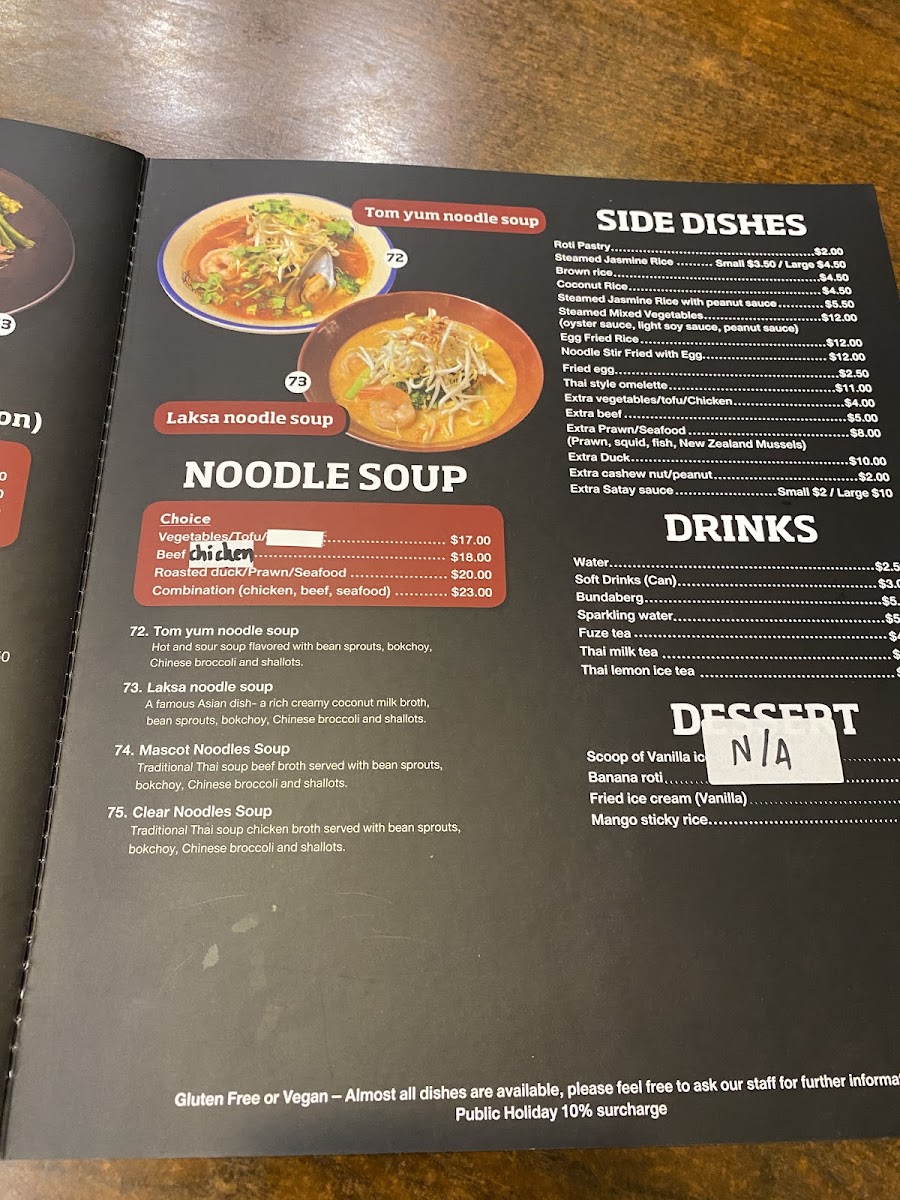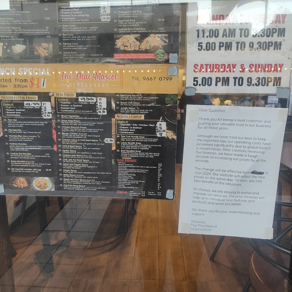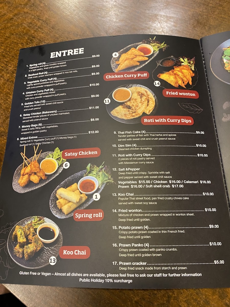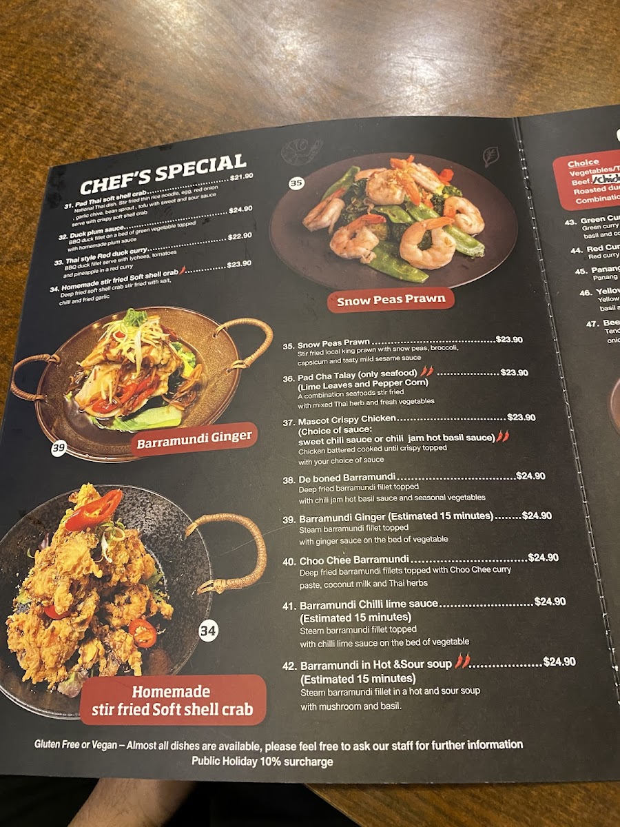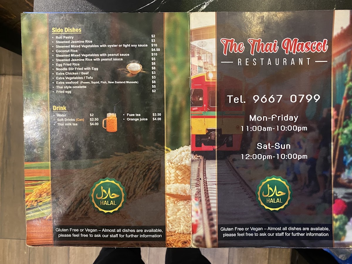 Dining at The Thai Mascot(Halal) is a journey through the vibrant flavors of Thailand, with a menu that caters to a wide range of tastes while staying entirely halal. Starters like Thai Fish Cakes, Dim Sim, Money Bags Mixed Entree, and Golden Tofu offer a satisfying introduction to the meal. The noodle options are equally enticing, from stir-fried favorites such as Hokkien Noodles, Cashew Nuts Nut Noodles, Satay Noodles, Pad See Eiw, and Pad Kee Mao, to hearty soups including Beef Noodles Soup, Laksa Noodle Soup, Tom Yum Noodle Soup, and Duck Noodles Soup. Fried rice selections like Cashew Nuts Fried Rice, Pineapple Fried Rice, Egg Fried Rice, Tom Yum Fried Rice, and Thai Fried Rice complement the mains perfectly. Curry lovers will appreciate classics like Yellow Curry, Green Curry, Beef Massaman, Panang Curry, and Red Curry, while the stir-fried dishes-Satay Sauce, Ginger Sauce, Mixed Vegetables, Chilli And Basil Sauce, and Pad Prik Khing Sauce-deliver bold, authentic flavors. Side dishes such as Egg Fried Rice, Steamed Jasmine Rice, Steamed Mixed Vegetables With Oyster Sauce, Steamed Jasmine Rice With Peanut Sauce, and Noodle Stir Fried With Egg round out the meal. Salads like Thai Chicken Salad, Prawns Salad, Papaya Salad, Deep Fried Tofu Salad, and Seafood Salad provide fresh, light options, while soups such as Po Tak Soup, Tom Yum Soup, and Tom Kha Soup highlight the signature tangy and aromatic flavors. The Chef’s Specials, including Snow Peas Prawn, BBQ Squid, Creamy Basil Curry, Choo Chee Barramundi, and Barramundi Chili Lime Sauce, showcase the restaurant’s creative flair and commitment to quality. With a concise drink selection of Can Of Soft Drinks and Water, The Thai Mascot(Halal) ensures a focused, flavorful, and authentically Thai dining experience that balances traditional dishes with inventive specials.