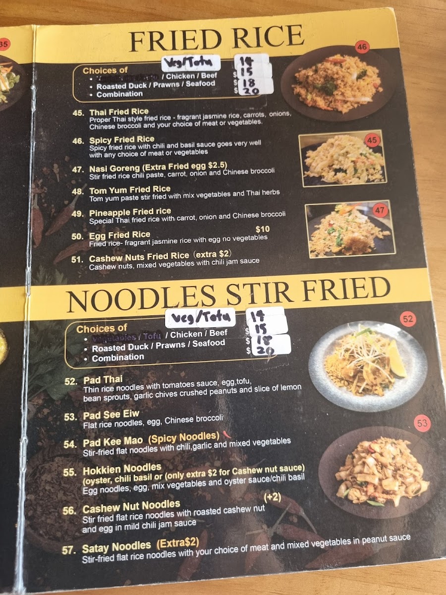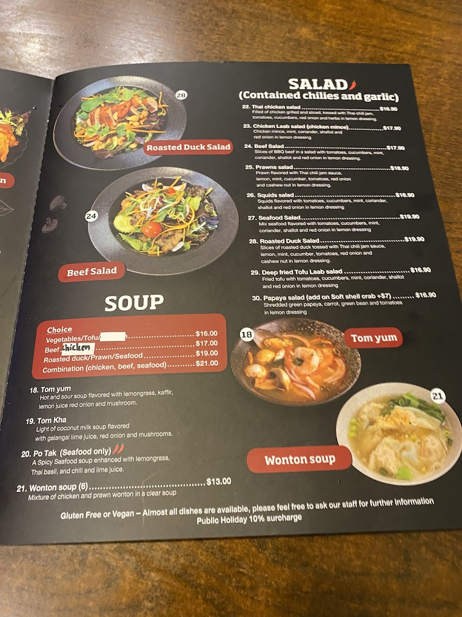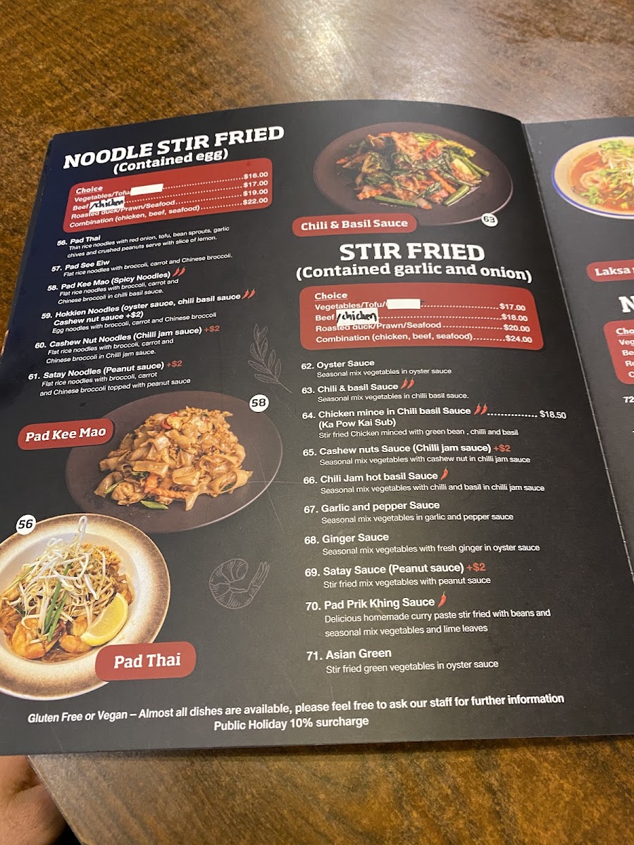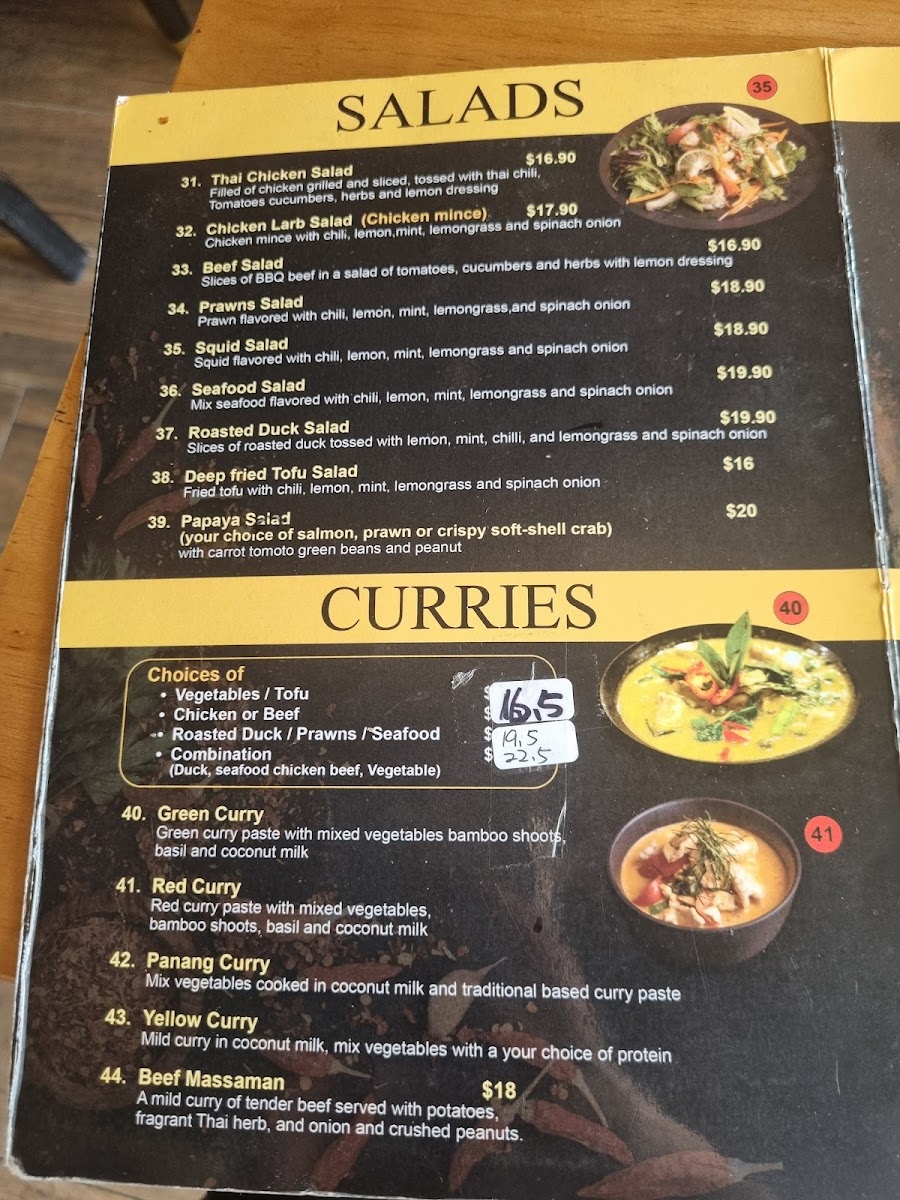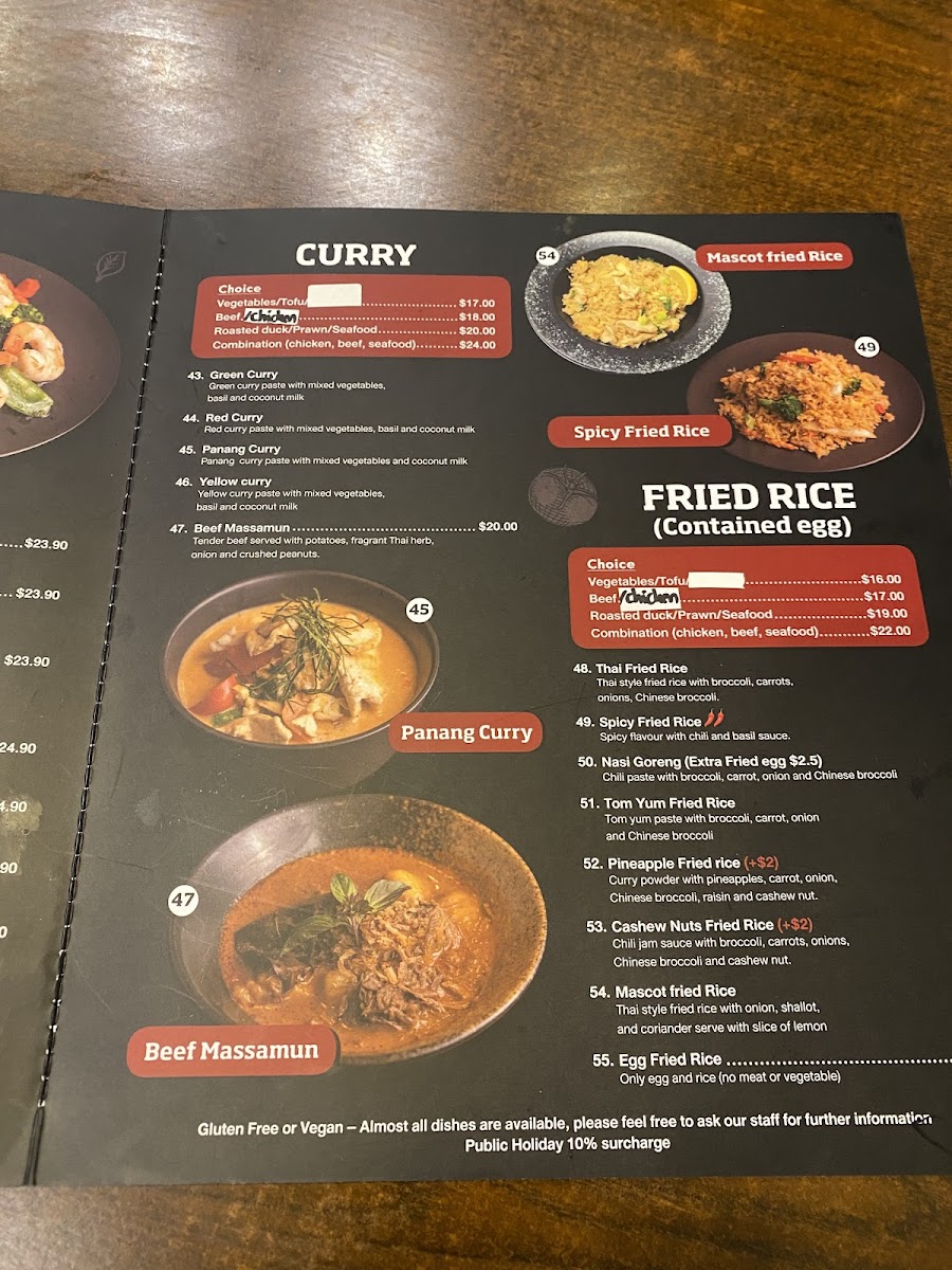 Dining at The Thai Mascot(Halal) is a journey through the vibrant flavors of Thailand, with a menu that caters to a wide range of tastes while staying entirely halal. Starters like Thai Fish Cakes, Dim Sim, Money Bags Mixed Entree, and Golden Tofu offer a satisfying introduction to the meal. The noodle options are equally enticing, from stir-fried favorites such as Hokkien Noodles, Cashew Nuts Nut Noodles, Satay Noodles, Pad See Eiw, and Pad Kee Mao, to hearty soups including Beef Noodles Soup, Laksa Noodle Soup, Tom Yum Noodle Soup, and Duck Noodles Soup. Fried rice selections like Cashew Nuts Fried Rice, Pineapple Fried Rice, Egg Fried Rice, Tom Yum Fried Rice, and Thai Fried Rice complement the mains perfectly. Curry lovers will appreciate classics like Yellow Curry, Green Curry, Beef Massaman, Panang Curry, and Red Curry, while the stir-fried dishes-Satay Sauce, Ginger Sauce, Mixed Vegetables, Chilli And Basil Sauce, and Pad Prik Khing Sauce-deliver bold, authentic flavors. Side dishes such as Egg Fried Rice, Steamed Jasmine Rice, Steamed Mixed Vegetables With Oyster Sauce, Steamed Jasmine Rice With Peanut Sauce, and Noodle Stir Fried With Egg round out the meal. Salads like Thai Chicken Salad, Prawns Salad, Papaya Salad, Deep Fried Tofu Salad, and Seafood Salad provide fresh, light options, while soups such as Po Tak Soup, Tom Yum Soup, and Tom Kha Soup highlight the signature tangy and aromatic flavors. The Chef’s Specials, including Snow Peas Prawn, BBQ Squid, Creamy Basil Curry, Choo Chee Barramundi, and Barramundi Chili Lime Sauce, showcase the restaurant’s creative flair and commitment to quality. With a concise drink selection of Can Of Soft Drinks and Water, The Thai Mascot(Halal) ensures a focused, flavorful, and authentically Thai dining experience that balances traditional dishes with inventive specials.